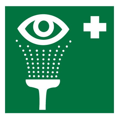 Медицинский и санитарный знак безопасности с пиктограммой, размер 200х200 мм., указывающий место, где можно получить первую помощь или пройти санитарную обработку глаз. Знак изготавливается в соответствии с ГОСТ 12.4.026-2015. Выполнен из самоклеящейся пленки. Размещается на стенах, дверях или входах в помещения с оборудованием для промывки глаз, например, на производстве, в лабораториях, где есть риск попадания химических веществ в глаза.