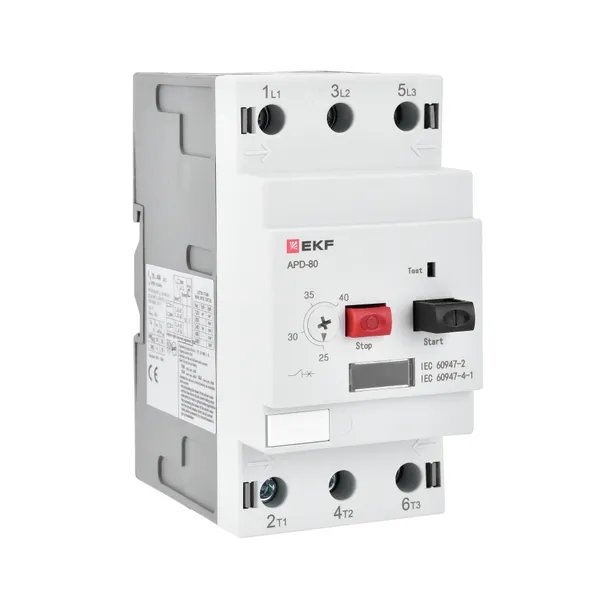 Автоматические выключатели пуска двигателя серии АПД-80 EKF PROxima с термомагнитным расцепителем специально предназначены для коммутаций цепей переменного тока напряжением до 690 В частотой 50/60 Гц, а также для управления и защиты трехфазных асинхронных двигателей от перегрузки, обрыва фазы, короткого замыкания.