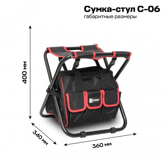 Сумка-стул С-06 EKF Professional особенно незаменим при проведении работ, связаных с монтажом электроустановочных изделий – розеток, выключателей. Усиленная стальная рама для безопасности. Выдерживает вес до 120 кг. Унифицированный со всеми моделями ремень с мягким нескользящим наплечником не скатывается с плеча при переноске. Выдерживает до 25 кг. Отстегивающаяся сумка может использоваться отдельно. Данная модель незаменима не только при проведении электроустановочных работ. но и в быту, а особенно рекомендуется для отдыха на природе.