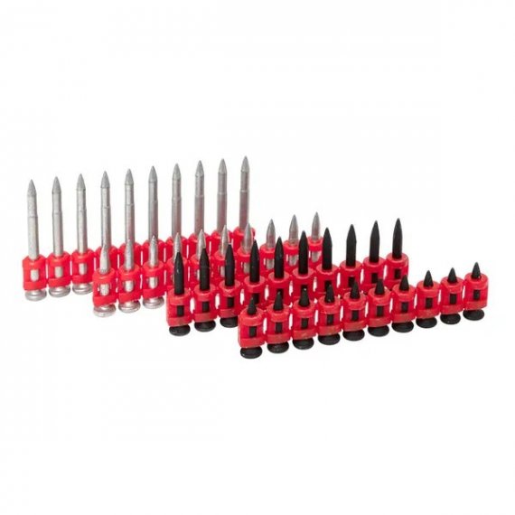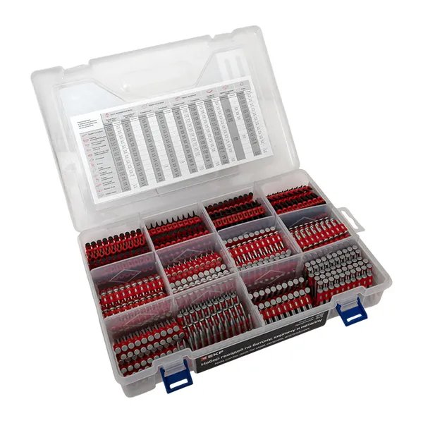 Набор гвоздей для бетона, кирпича и металла включает 10 различных видов гвоздей, что позволяет выбрать подходящую длину и тип в зависимости от материала основания. Внутри инструкция по рекомендуемым и подходящим размерам гвоздей для различных материалов. В состав входят универсальные гвозди с диаметром 2,7 мм и длинной от 17 до 25 мм и усиленные гвозди диаметром 3 мм и длинной от 17 до 38 мм.