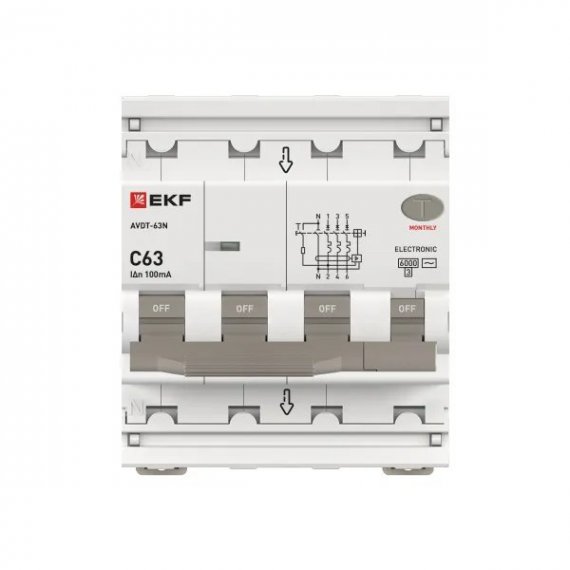 Автоматический выключатель дифференциального тока АВДТ-63N 3P+N 63А характеристика C 100мА тип AC электронный 6кА PROXIMA EKF