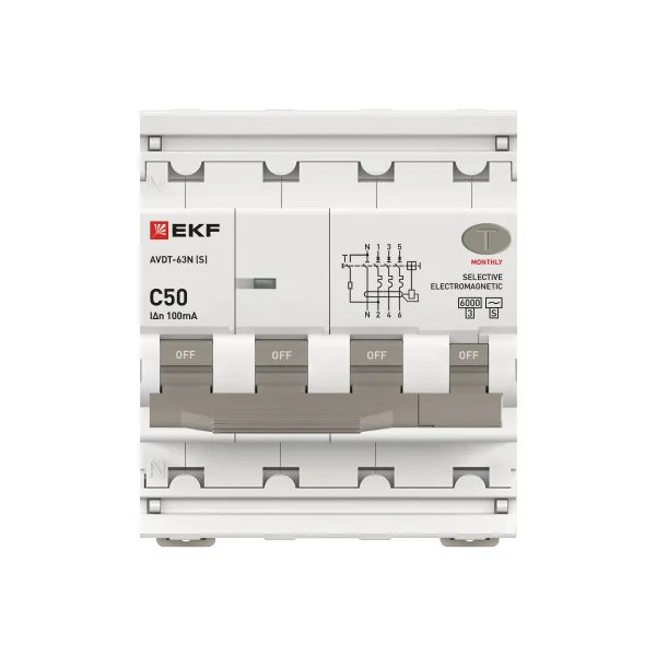 Автоматический выключатель дифференциального тока АВДТ-63N 3P+N (S) 50А характеристика C 100мА тип AC электромеханический селективный 6кА PROXIMA EKF