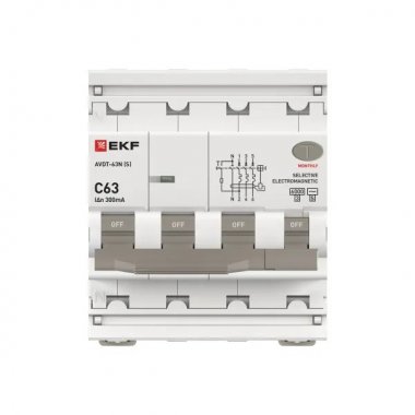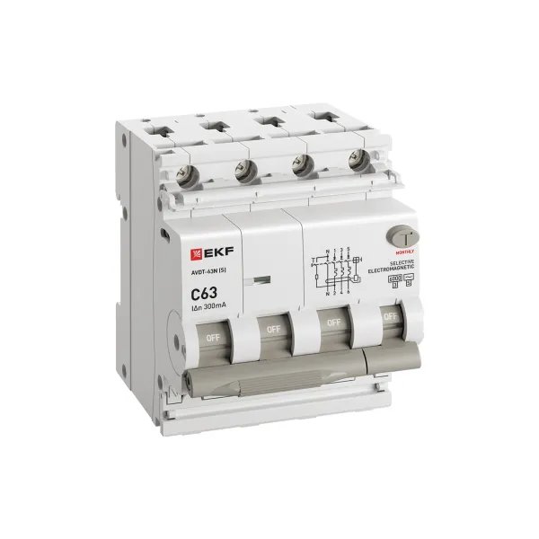 Автоматический выключатель дифференциального тока АВДТ-63N 3P+N (S) 63А характеристика C 300мА тип AC электромеханический селективный 6кА PROXIMA EKF