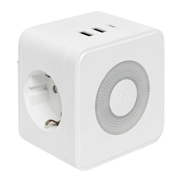 Тройник EKF серии Куб предназначен для подключения к электрической сети всех видов бытовой и офисной техники, для зарядки и питания устройств через порты USB, а также для подсветки помещений в качестве ночника