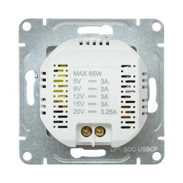 Розетка USB Type-C на 65 Вт EKF коллекции «Эпика» с заземлением и защитными шторками - надежное и стильное решение для быстрой зарядки устройств без использования адаптеров. Корпус выполнен из прочного пластика, устойчивого к воздействию ультрафиолета, что гарантирует долговечность и сохранение внешнего вида. Изделие совместимо с медным и алюминиевым кабелем, имеет винтовые клеммы. Винты имеют одинаковый шлиц, поэтому замена биты при монтаже не требуется Для гармоничного оформления интерьера рекомендуется использовать с рамкой из той же коллекции.