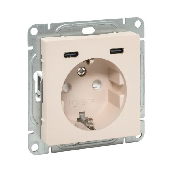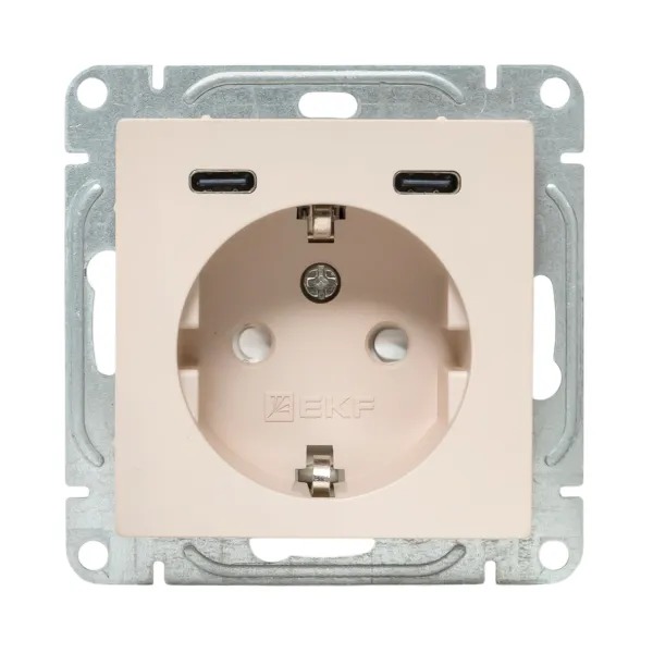 Механизм розетки с USB-C - 2шт, 16А, с заземлением, со шторками, кремовый Эпика EKF